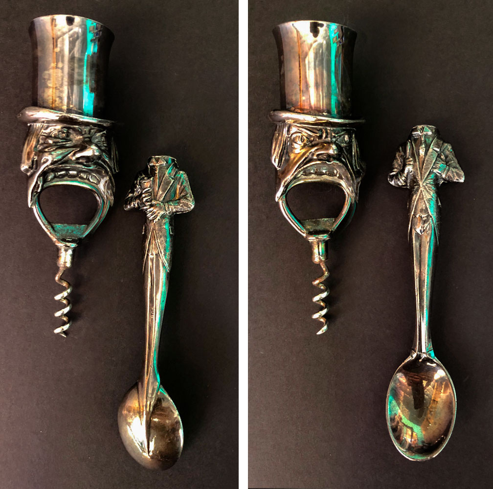 One of these products inspired by “Mr. Dry” was a corkscrew designed in the 1930s called the Old Snifter. The bottle opener is created by the figure’s nose and collar. The corkscrew is hidden in the figure’s coat and folds up to open corked bottles then folds down to hide when not in use. His hat is painted in black and sits atop his head. It is removable, and there is a small opening that possibly held toothpicks. A congressional ribbon decorates his lapel. The Demley version was manufactured by Heller of Chicago. The Wine History Project version (WHP-CR982) has a marking of Germany etched on the bottom of the figure. It is made of pewter and the figure stands 6¾ inches tall.